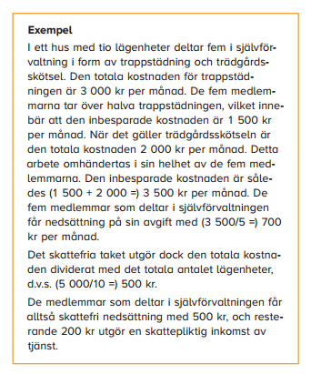 En bostadsrättsförening kan låta någon eller några av dess medlemmar utföra enklare förvaltningsuppgifter på föreningens fastighet mot nedsatt årsavgift. Till enklare förvaltningsuppgifter räknas sådant som normalt sett skulle kunna utföras av alla bostadsrättsinnehavare. Exempel på sådana göromål är enklare trädgårdsskötsel, trappstädning, enklare reparationer, byte av glödlampor och annan förbrukningsmateriel, tillsyn källarutrymmen, vindar, garage och tvättstugor.