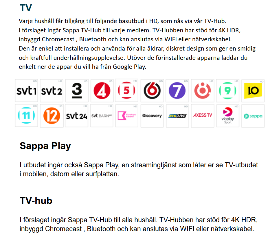 Nytt TV-avtal 2026 08 oktober 2025 Vi har tecknat ett nytt avtal för IP-TV med Sappa. Det nya avtalet kommer att börja gälla 2026-02-01.I avtalet ingår nya modernare TV-boxar och fler kanaler än vad vi har nu.Klicka på bilden nedan så får du mer information. Filer Sappa_nytt_avtal_2026.png
